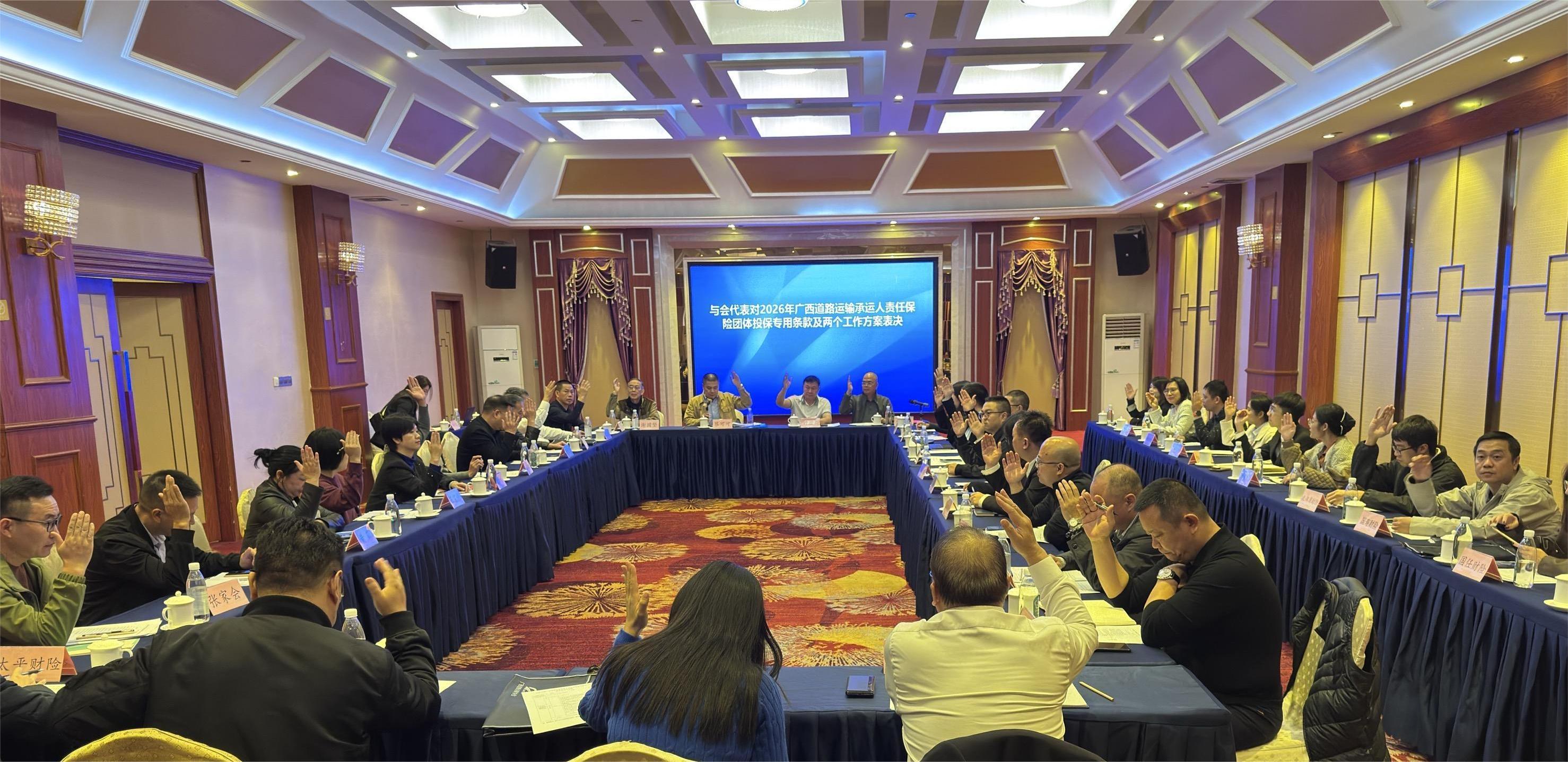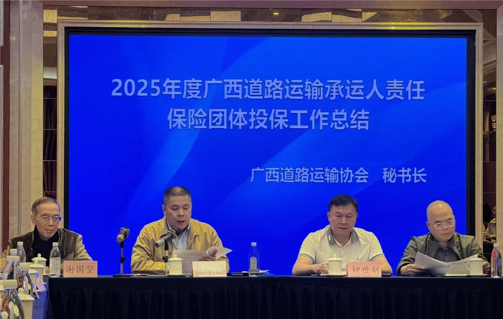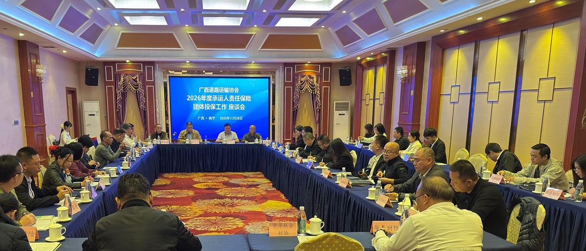 2025 年 11 月 28 日下午,广西道路运输协会(以下简称 “协会”)在南宁市顺利召开 2026 年度广西道路运输承运人责任保险团体投保工作座谈会。道路运输行业专家、保险公司代表、协会领导及会员单位代表共计 45 人参会。