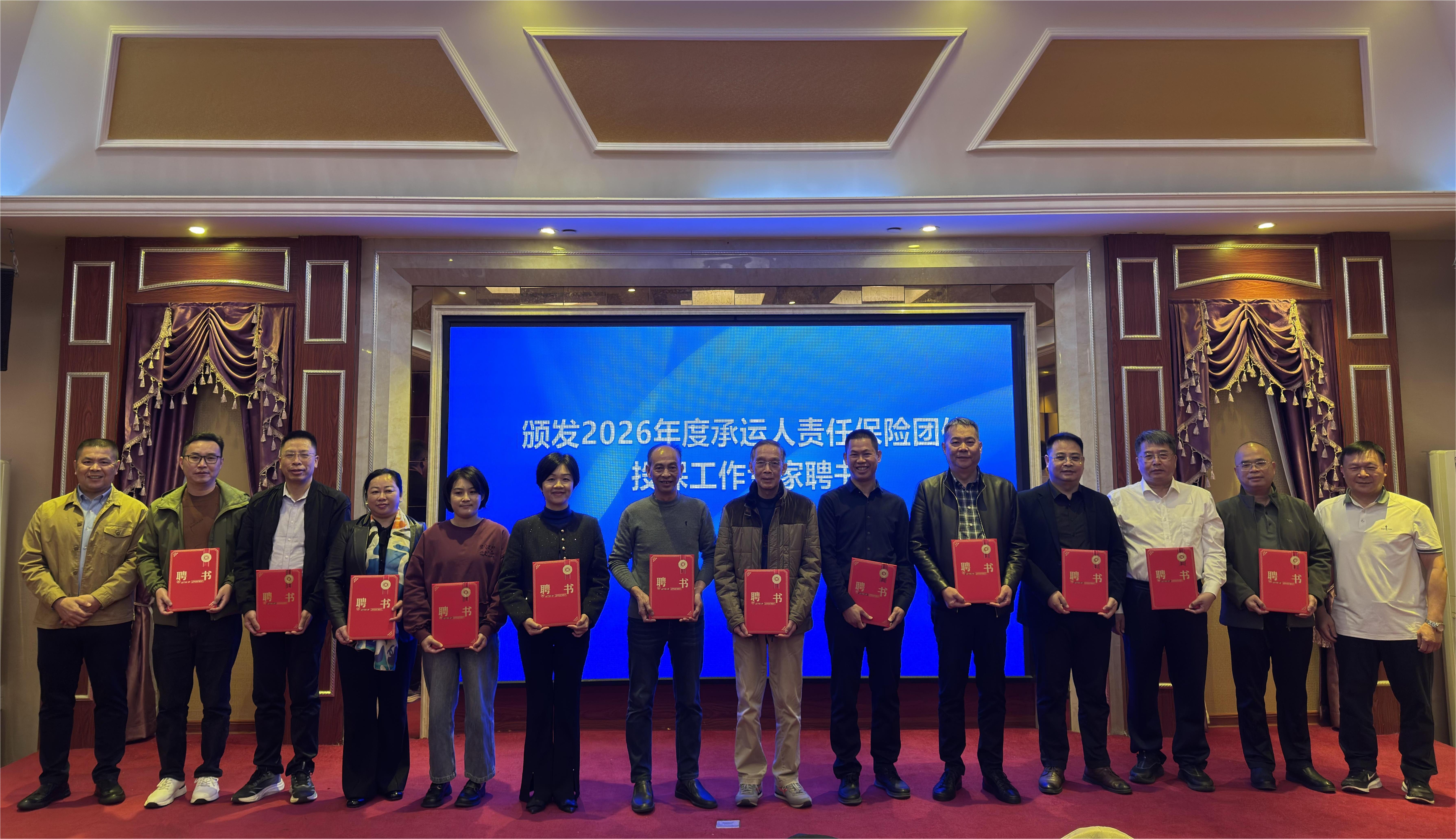 会议由广西道路运输协会秘书长蔡可可主持。大会伊始,蔡可可宣读《关于聘任凌冠昌等同志任协会2026 年度承运人责任保险团体投保专家组专家的通知》,并由协会会长钟世新为 12 位受聘专家颁发聘书。这份聘任既是对专家专业能力的高度认可,更是赋予了推动行业安全发展的重要责任。