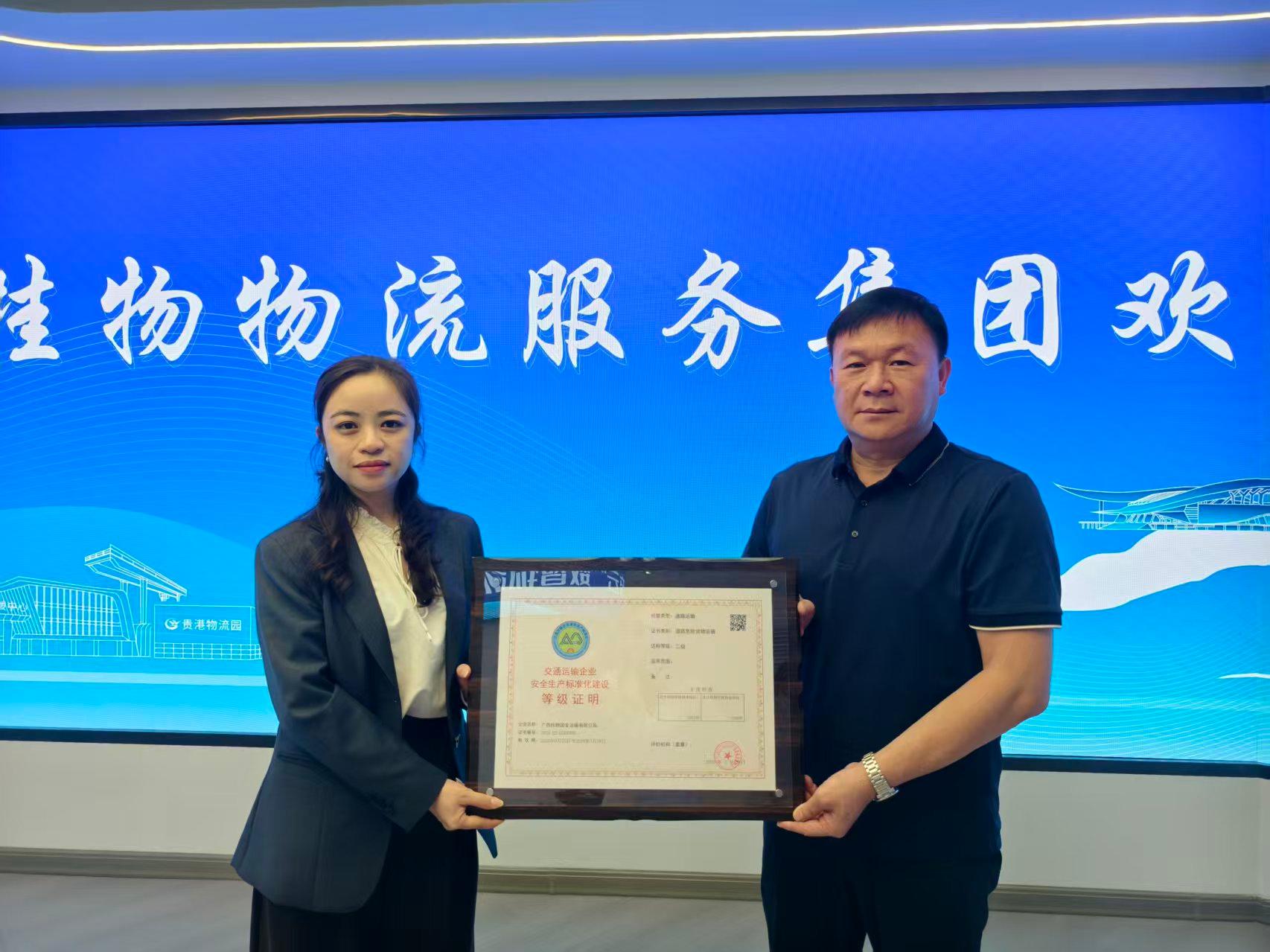 前期,广西道路运输协会为广西桂物物流服务集团控股子公司广西桂物国安运输有限公司提供安全生产标准化建设服务。按照工作流程,经企业自评、申请,协会审查、现场核查及公示等程序,协会认定广西桂物国安运输有限公司符合交通运输企业安全生产标准化建设要求,并现场发放了安全生产标准化等级证明。