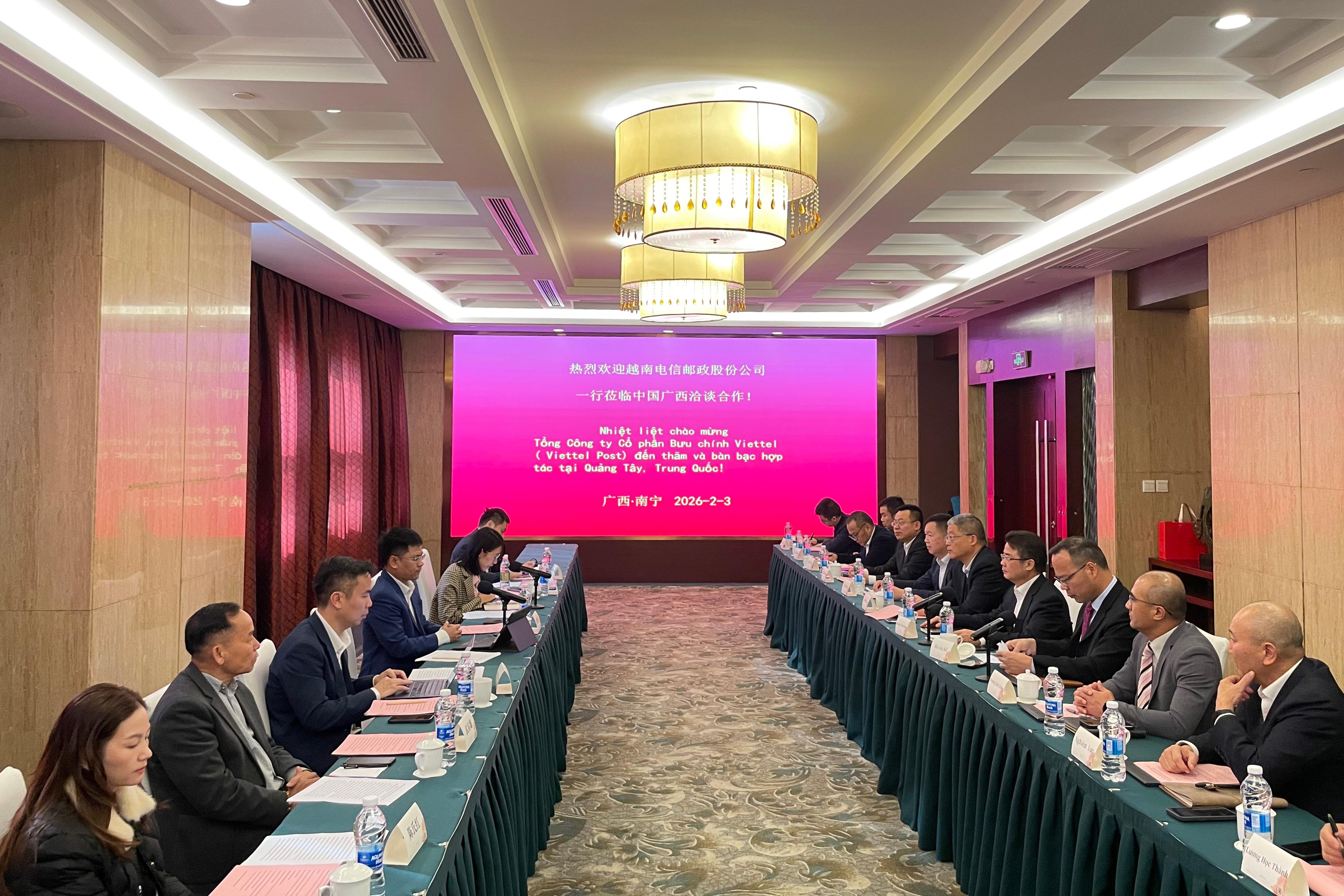 2026年2月3日,广西道路运输协会国际道路运输分会及广西相关企业与越南电信邮政股份公司在南宁举行会谈,双方就中越跨境物流与商贸合作进行深入探讨,并达成初步共识。交流会由广西道路运输协会副秘书长黄天欢主持。