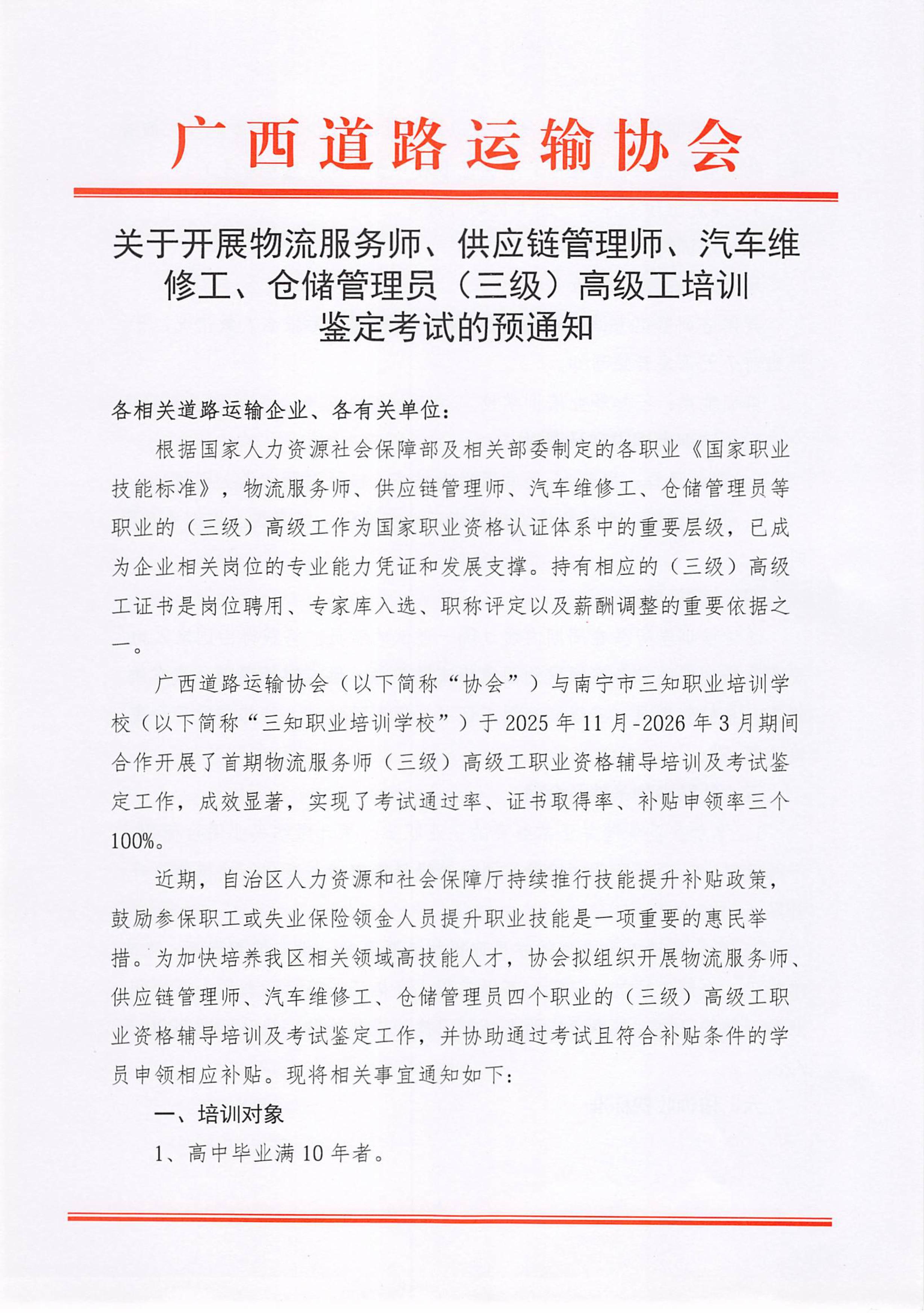 关于开展物流服务师、供应链管理师、汽车维修工、仓储管理员(三级)高级工培训鉴定考试的预通知