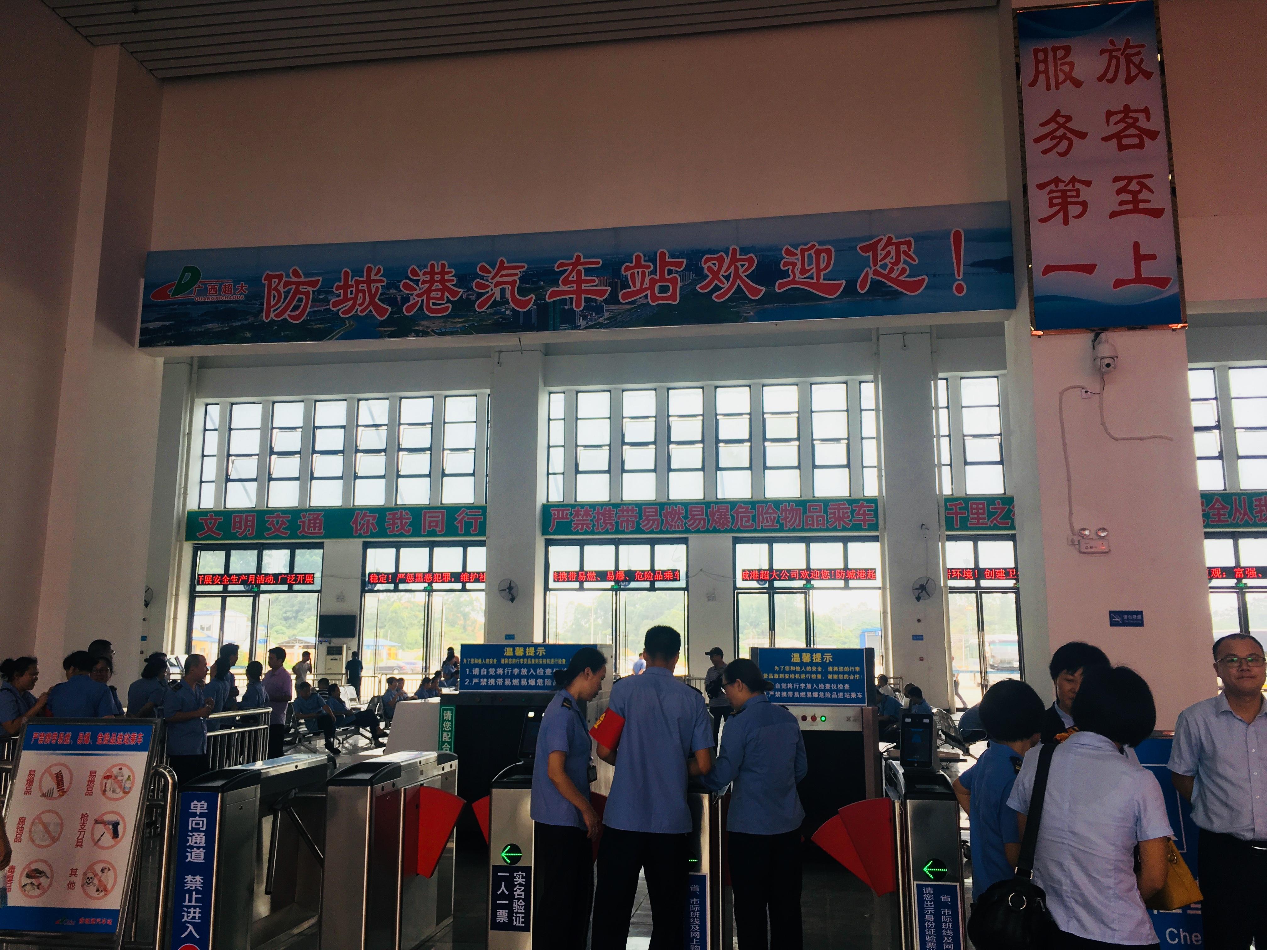 防城港汽车站位于防城港高铁北站北侧,是防城港市城市综合交通枢纽(防城港高铁北站、防城港汽车站、防城港公交站、站前广场)的重要组成部分。是广西防城港超大运输有限责任公司的下属单位,总投资为1.75亿元(含防城港公交站),按国家一级汽车客运站标准设计和建设,占地面积约104亩,建筑面积19000平方米,设计发送能力为20000人次/日,发车位20多个,停车位约600个,日可接纳营运客车1200班次。